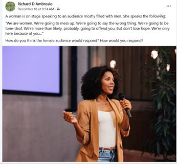 And I think that my reaction is inherently human. So this week, I tested my theory on Facebook. I posted the following text, accompanied by a picture of a female speaker on a stage.